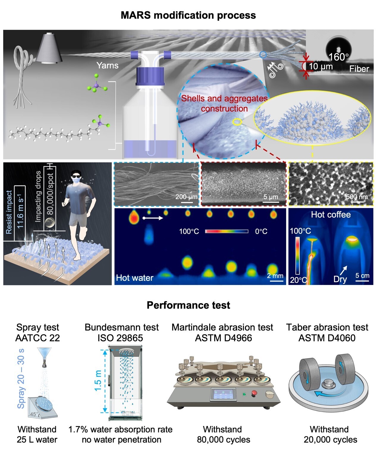 The researchers systematically evaluated the stability of MARS-treated fabrics under harsh conditions. Under prolonged raindrop impact and high-speed droplet impact, the fabric remained superhydrophobic. In standard abrasion tests (e.g., Martindale and Taber tests), MARS-treated fabrics remained superhydrophobic even after tens of thousands of abrasion cycles. Durability was further validated through simulated wear conditions, including friction from backpack straps, stretching cycles, brushing, tape peeling, and activities such as running and walking.
